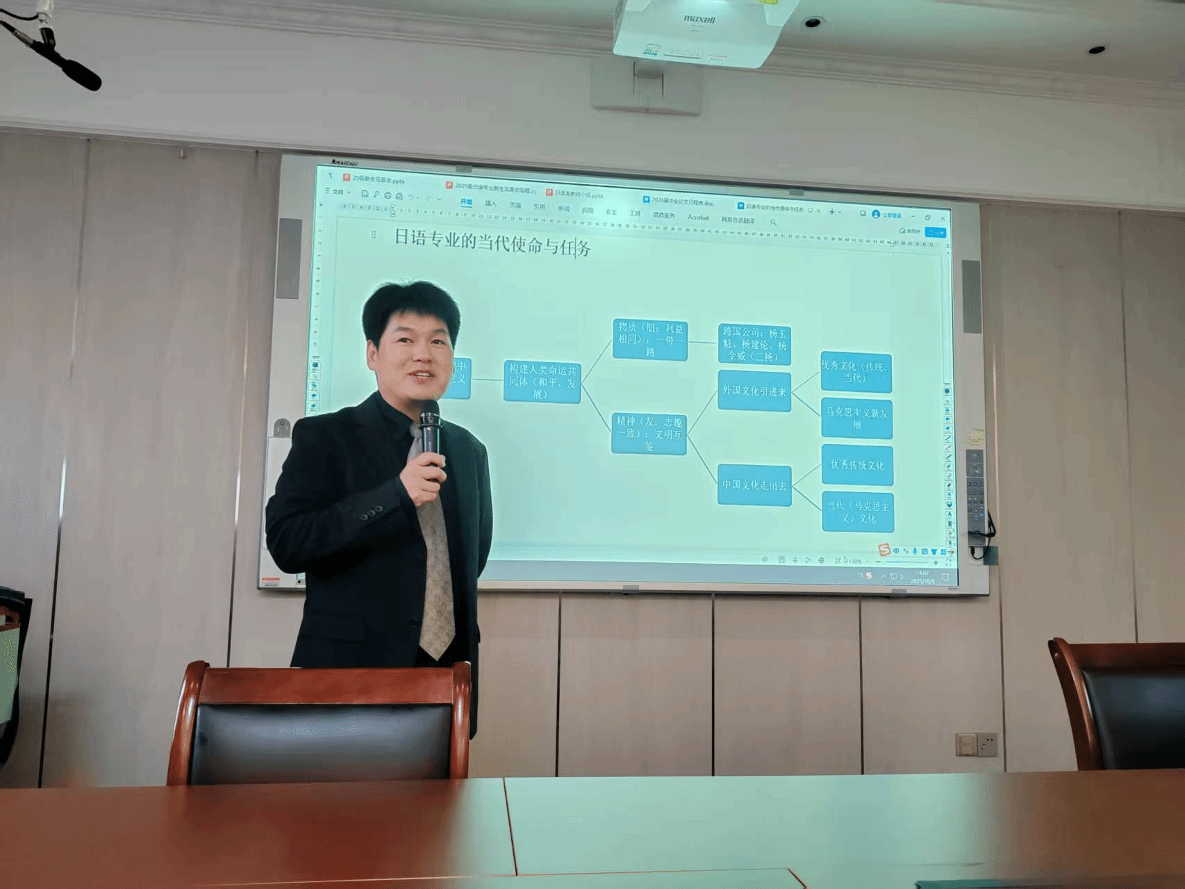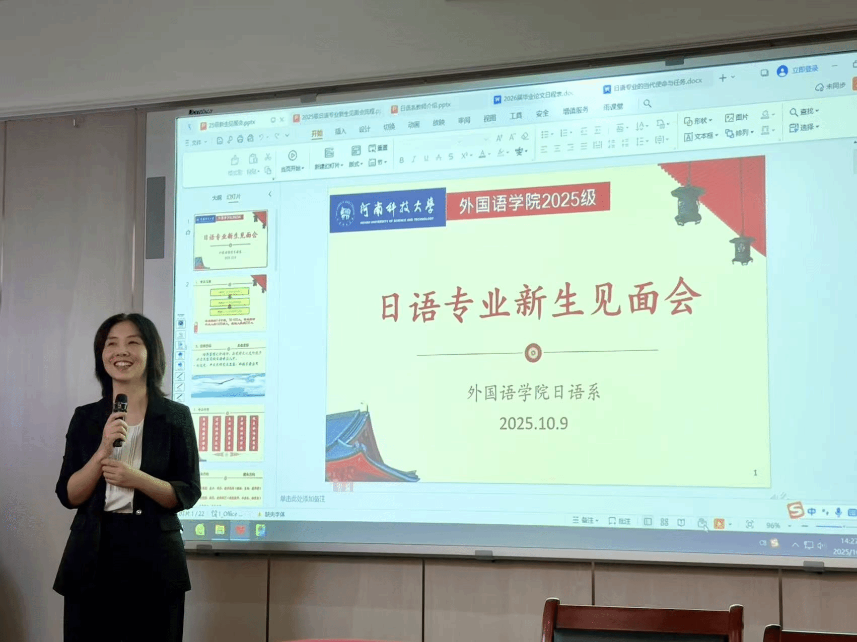 为帮助日语专业新生快速了解专业情况、明确学习方向,尽快适应大学生活,10月9日,外国语学院在文科1号教学楼401报告厅举行2025级日语专业新生见面会。日语专业全体教师与60余名新生参会,见面会由日语系杨超老师主持。