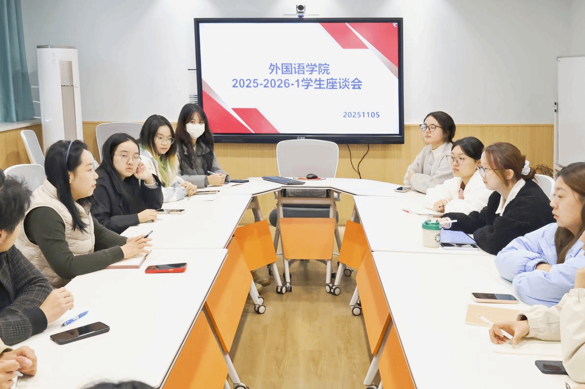 11月5日下午,外国语学院在文科1号楼518会议室召开2025-2026学年第一学期期中教学座谈会。学院副院长张丹教授、教学秘书孙颖及各年级学生代表参会,围绕学习生活保障、教学管理优化、职业规划指导等议题交流。