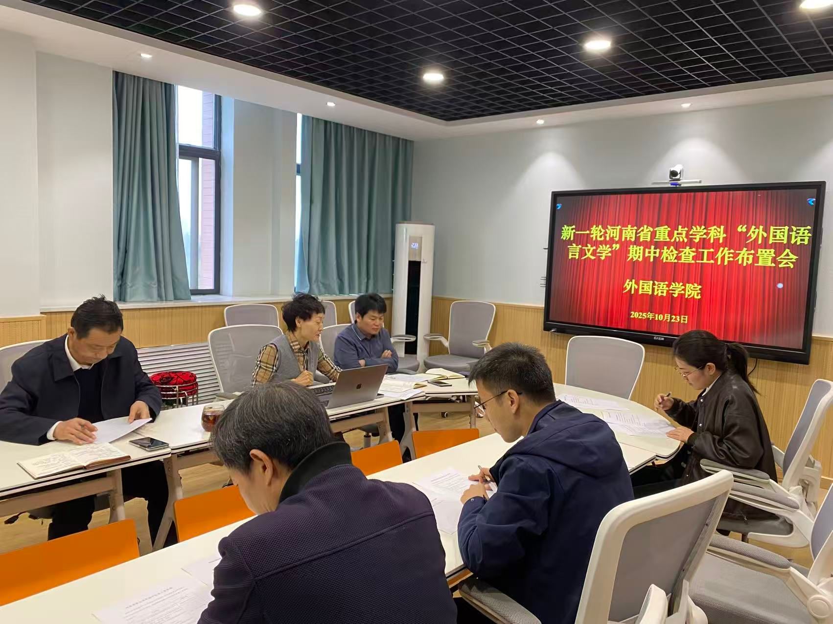 10月23日下午,外国语学院在文1-518召开河南省新一轮重点学科“外国语言文学”期中建设检查工作布置会。学院领导班子、学科方向带头人、学术骨干教师以及学科秘书、教学秘书、研究生秘书等参加会议。刘佳副院长传达了校学科建设办公室省重点学科中期检查工作布置会的会议精神及具体要求。会议成立了以学院党政领导为组长,分管副院长为副组长、学术骨干教师等为成员的重点学科中期检查工作专班,制定了切实可行的详细工作计划。岳中生院长指出,重点学科中期考核评估关系到学院的学科建设及学院整体发展,希望大家高度重视,密切配合,全身心投入,打好攻坚战。