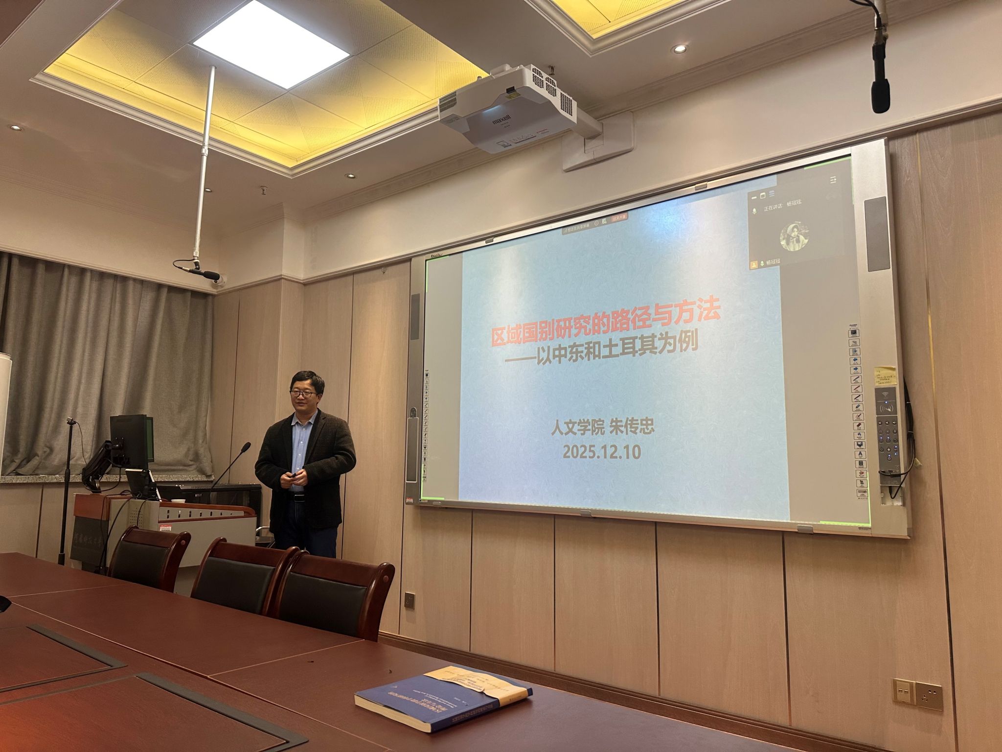 12月10日,河南科技大学人文学院朱传忠副教授应邀在开元校区文科1-401为我院2025级全体研究生作了题为《区域国别研究的路径与方法—以中东和土耳其研究为例》的学术报告。讲座由外国语学院副院长刘佳教授主持。